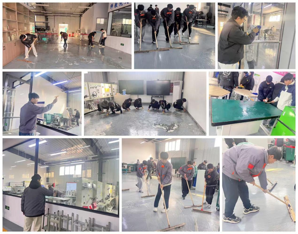 历经数小时奋战,原本因一学期实训而略显杂乱、布满灰尘的车间焕然一新,窗明几净,设备整齐,工量具清晰了然。此次大扫除,既为下学期实训教学铺就良好开端,又在期末关键节点,舒缓师生备考压力,凝聚团队力量,彰显学院师生的精神风采,更为校园劳动教育添彩助力。未来,学院将持续深耕实训环境建设,推动教学质量稳步提升。
