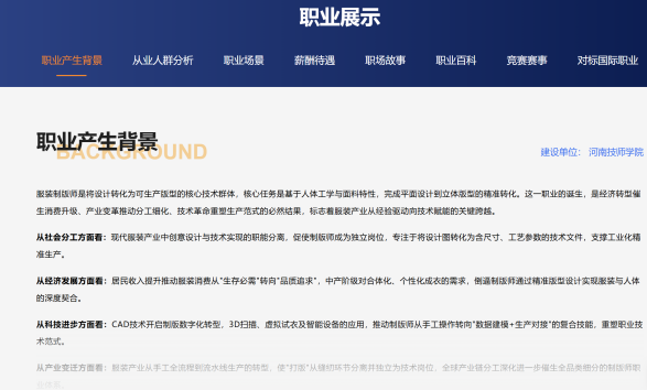 项目建设始终以“打造行业标杆”为核心目标,严格对标国家职业标准,对职业数字画像包含的五大模块、27项细分信息逐项精研审定。团队深度挖掘服装制版师的工作场景与专业内涵,将职业技能与职业精神有机融合,通过真实案例具象化呈现职业日常,让公众直观感知该职业的社会价值与独特魅力。