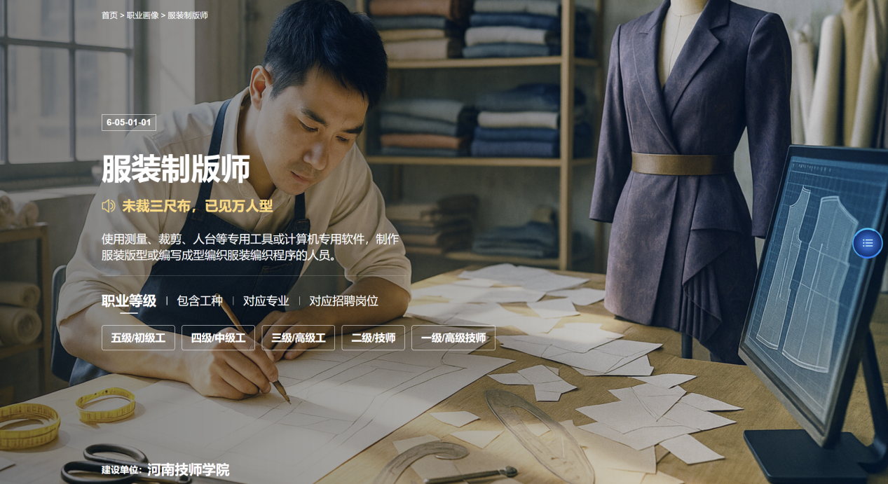 近日,由河南技师学院精心打造的《服装制版师》职业数字画像在中国就业网(chinajob.mohrss.gov.cn/zy/#/)正式上线,标志着我校圆满完成人社部委托的建设任务,为全国职业教育数字化转型贡献了“河南技师智慧”。