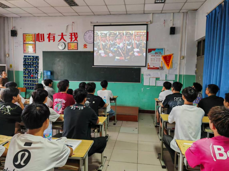 直播开始前,各班级同学有序就座,满怀期待。当威武的阅兵方阵、先进的武器装备一一呈现,现场不时爆发出热烈掌声,同学们为国家强大的军事力量和科技实力深感自豪。